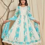 Be the first to review “Aqua Blue Floral Anarkali Suit Set With Lace Hem & Dupatta”