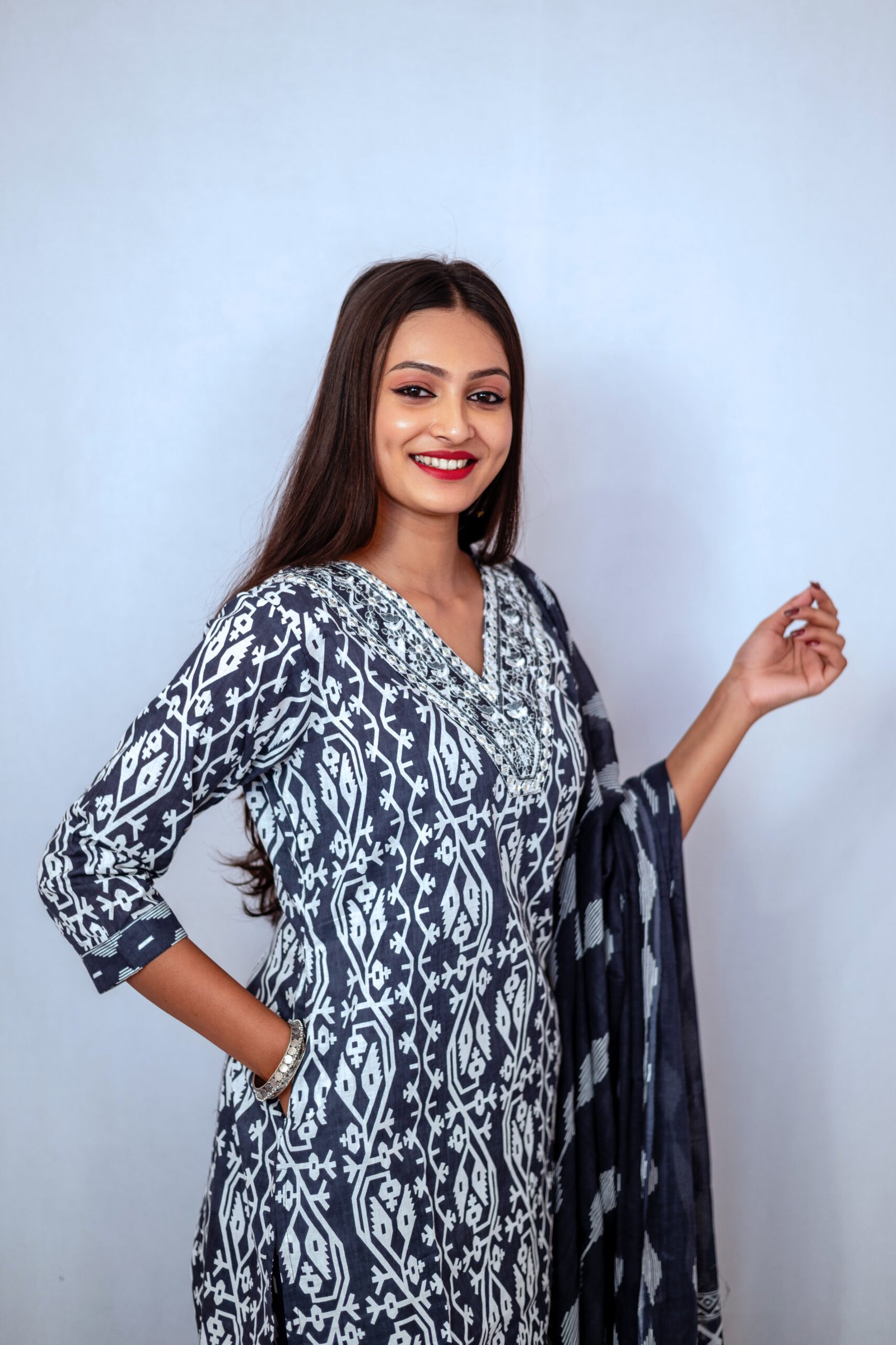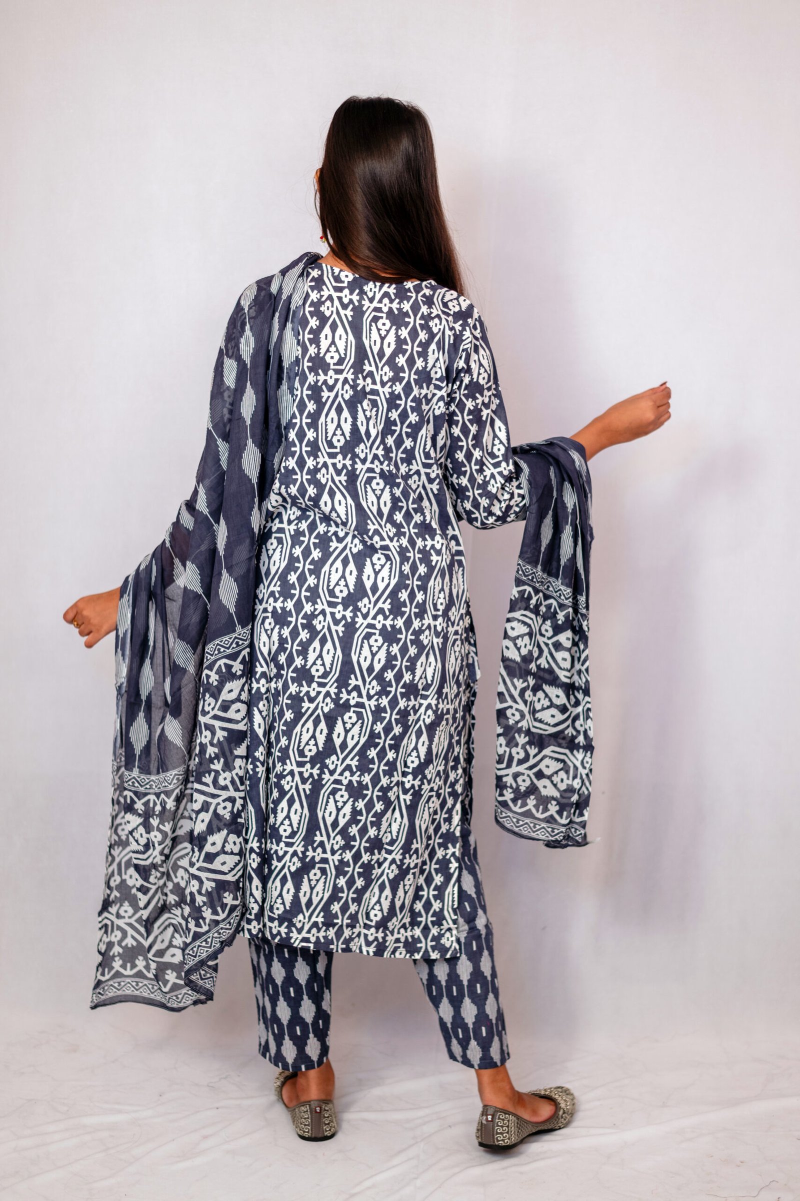 Upgrade your ethnic wardrobe with this stunning black Printed Kurta Pant Set with Dupatta, designed for women who love timeless style with modern comfort. Crafted in a rich blue shade with beautiful white botanical prints, this outfit creates a graceful and refreshing look perfect for every occasion.
