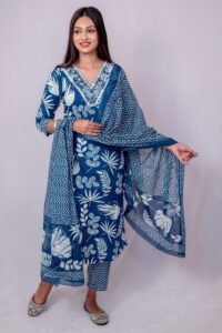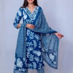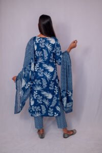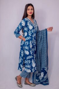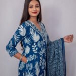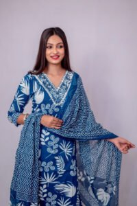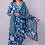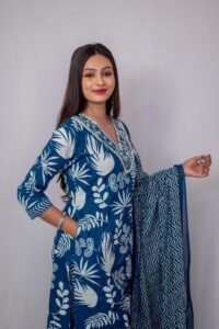 Upgrade your ethnic wardrobe with this stunning Blue Printed Kurta Pant Set with Dupatta, designed for women who love timeless style with modern comfort. Crafted in a rich blue shade with beautiful white botanical prints, this outfit creates a graceful and refreshing look perfect for every occasion.