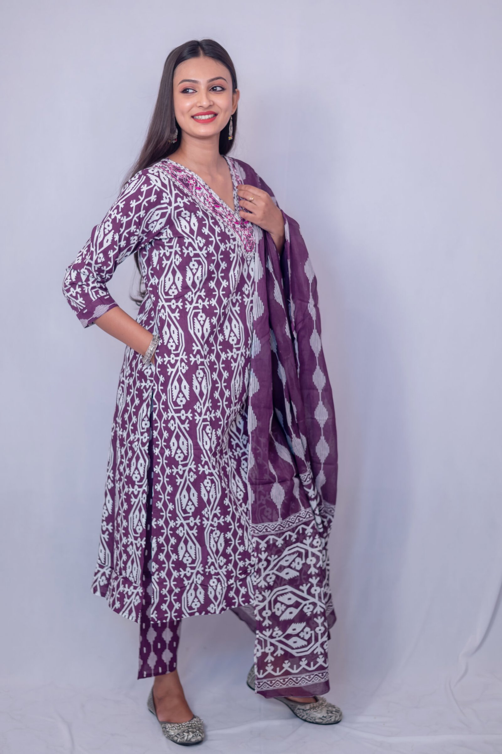 The kurta features a flattering straight silhouette with an elegant V-neckline enhanced by subtle detailing. Paired with stylish printed straight pants and a lightweight matching dupatta with coordinated patterns and borders, this set offers a complete and effortlessly chic ethnic ensemble.