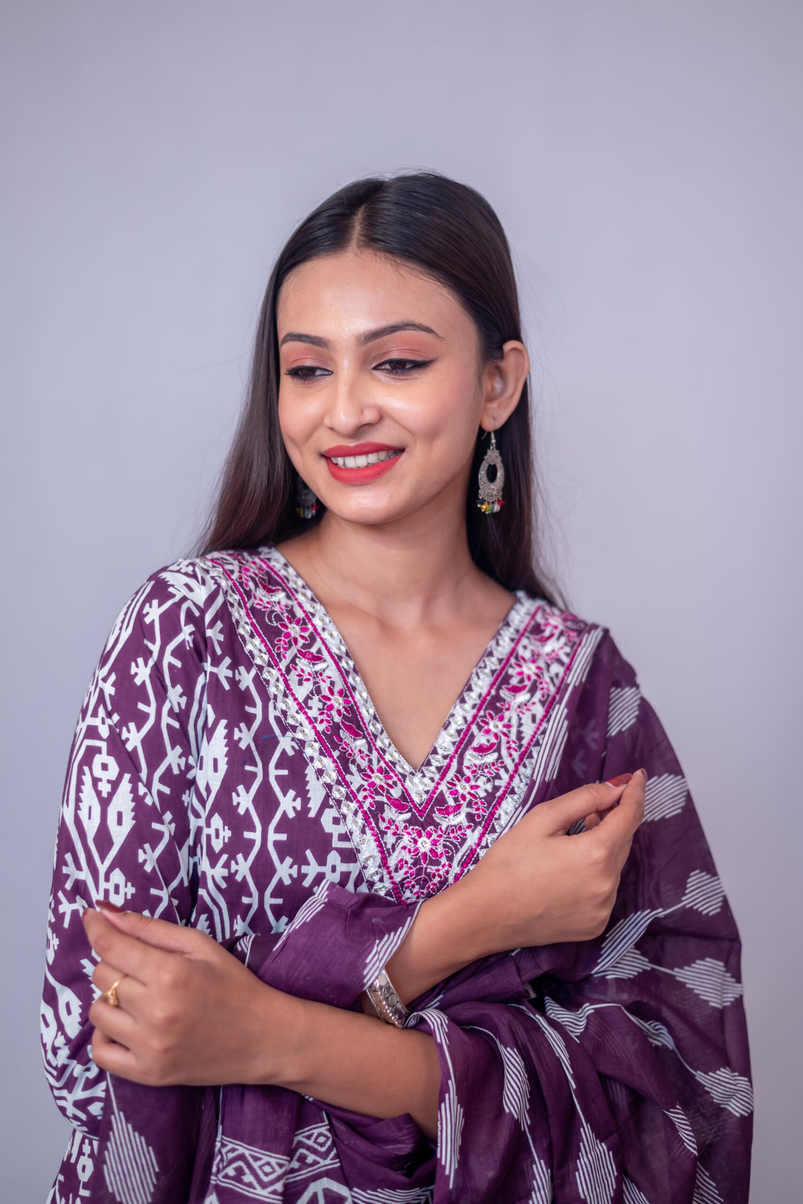 Elegant Purple Printed Kurta Pant Set with DupattaElegant Purple Printed Kurta Pant Set with Dupatta