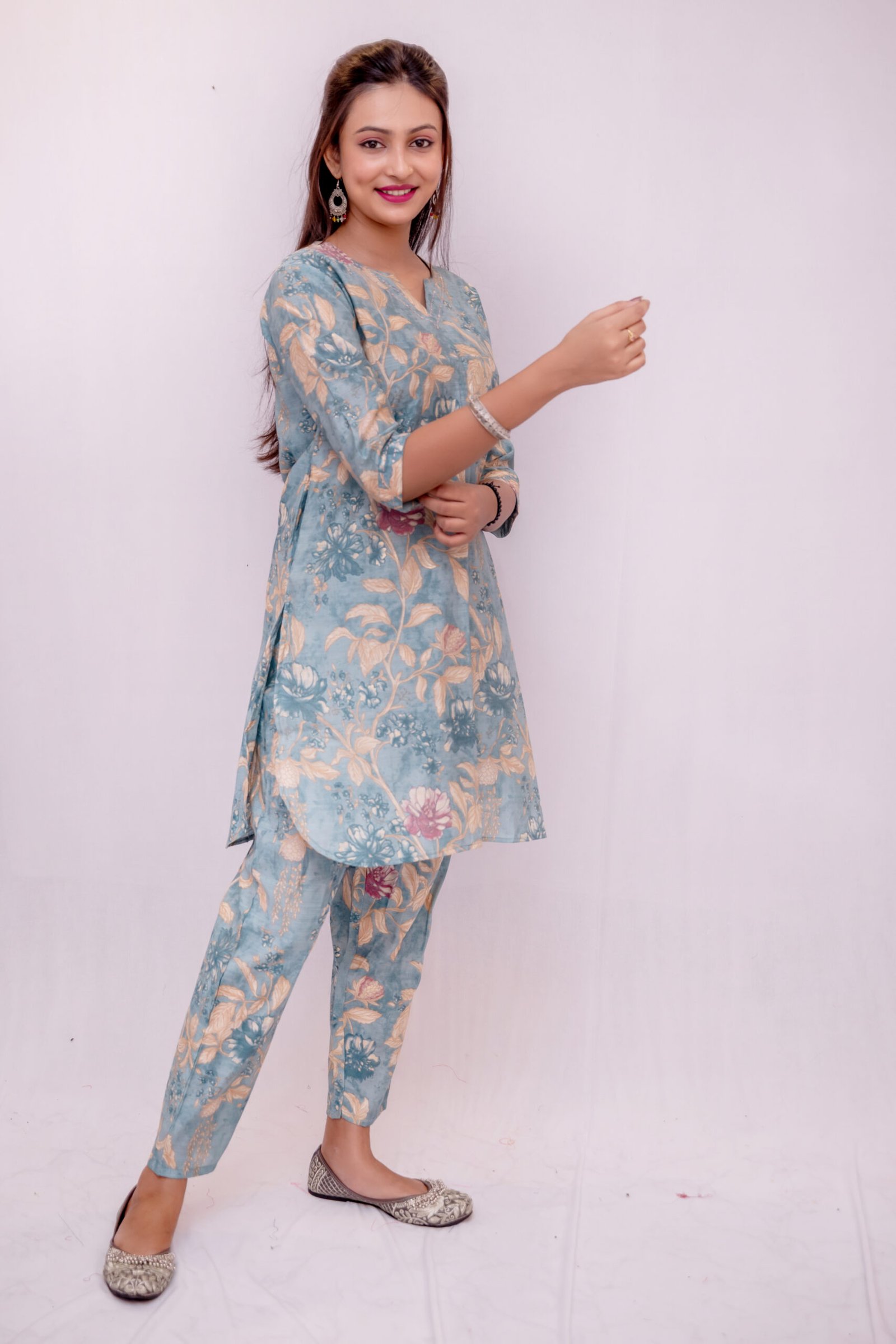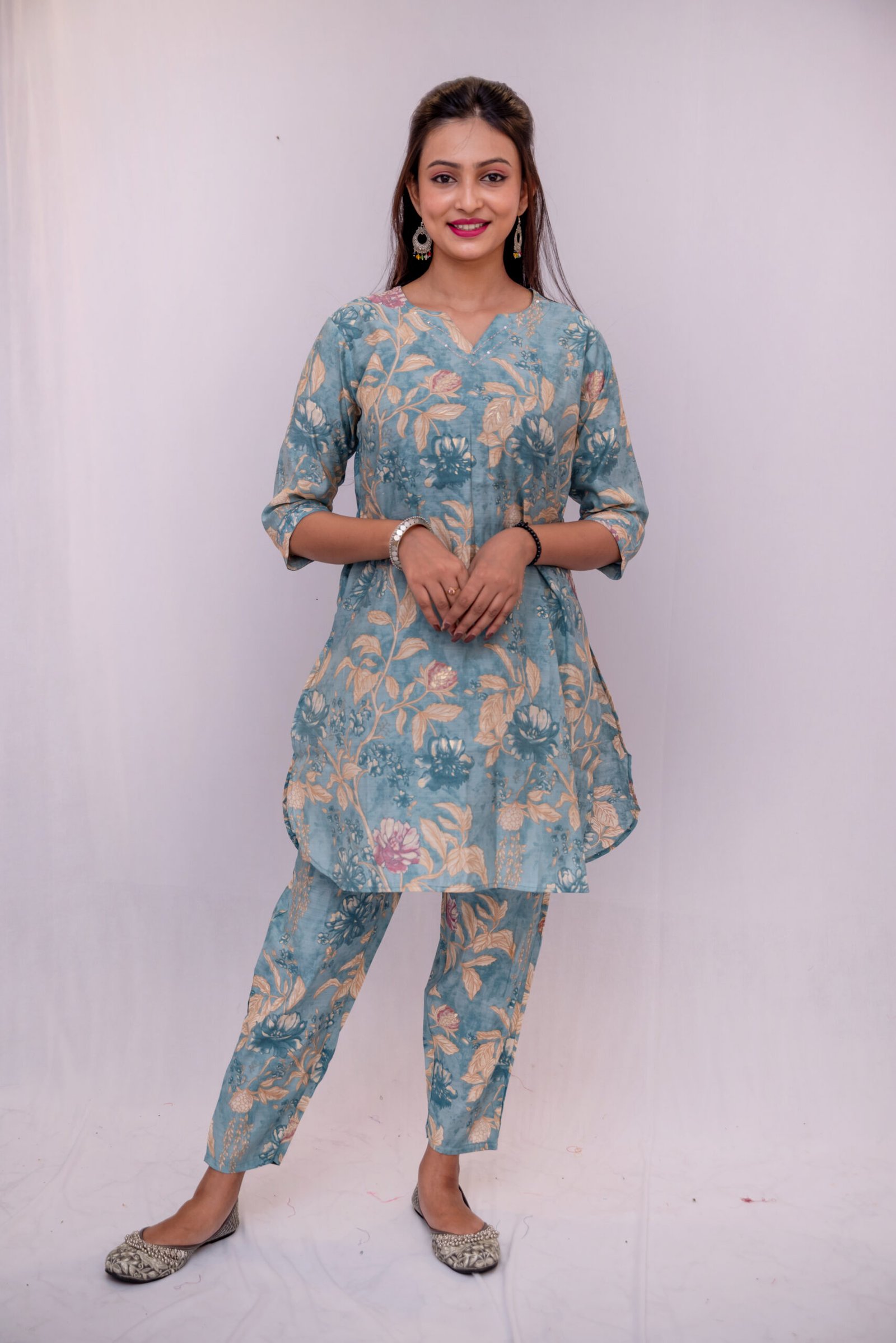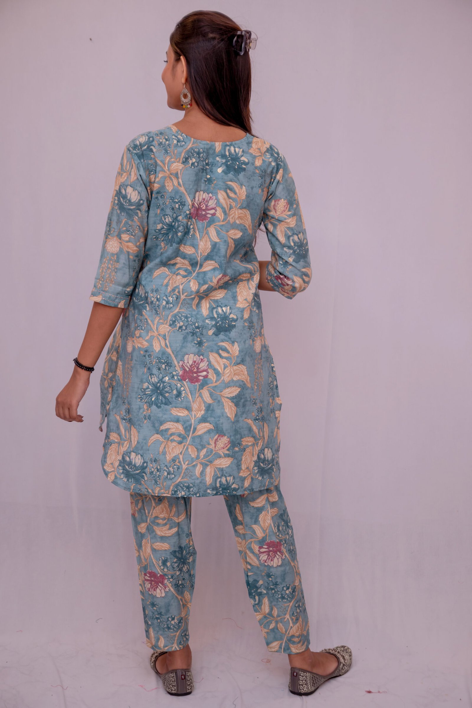Step into effortless elegance with this beautifully designed sky blue floral printed kurti pant set. Crafted from premium quality fabric, this outfit offers a soft, breathable feel that keeps you comfortable all day long.