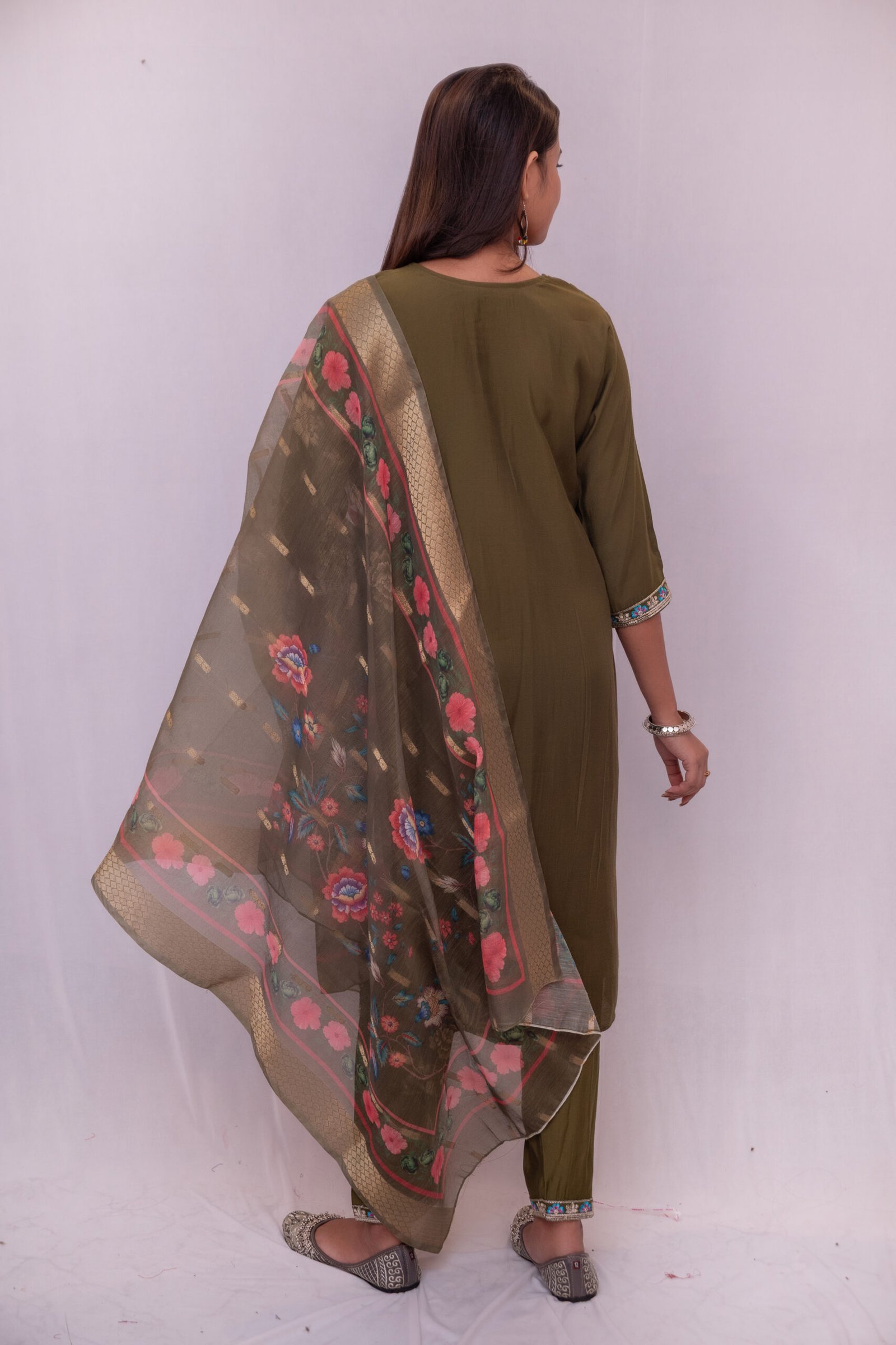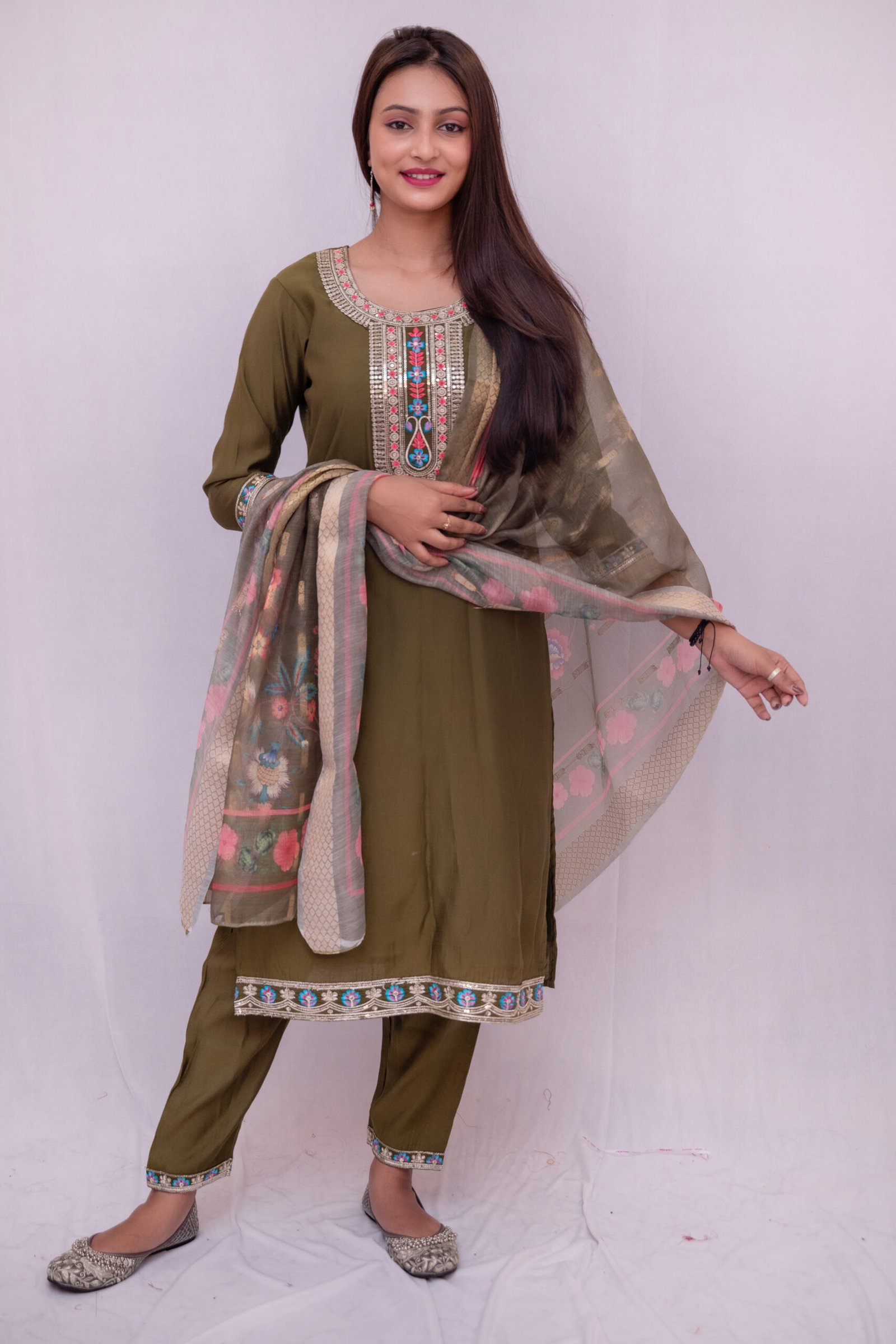 Upgrade your ethnic wardrobe with this elegant Olive Green kurti pant dupatta set, designed to bring out timeless grace and comfort. Crafted from soft and breathable rayon fabric, this kurti features a beautifully detailed embroidered neckline with vibrant multicolor thread work that enhances its festive appeal.