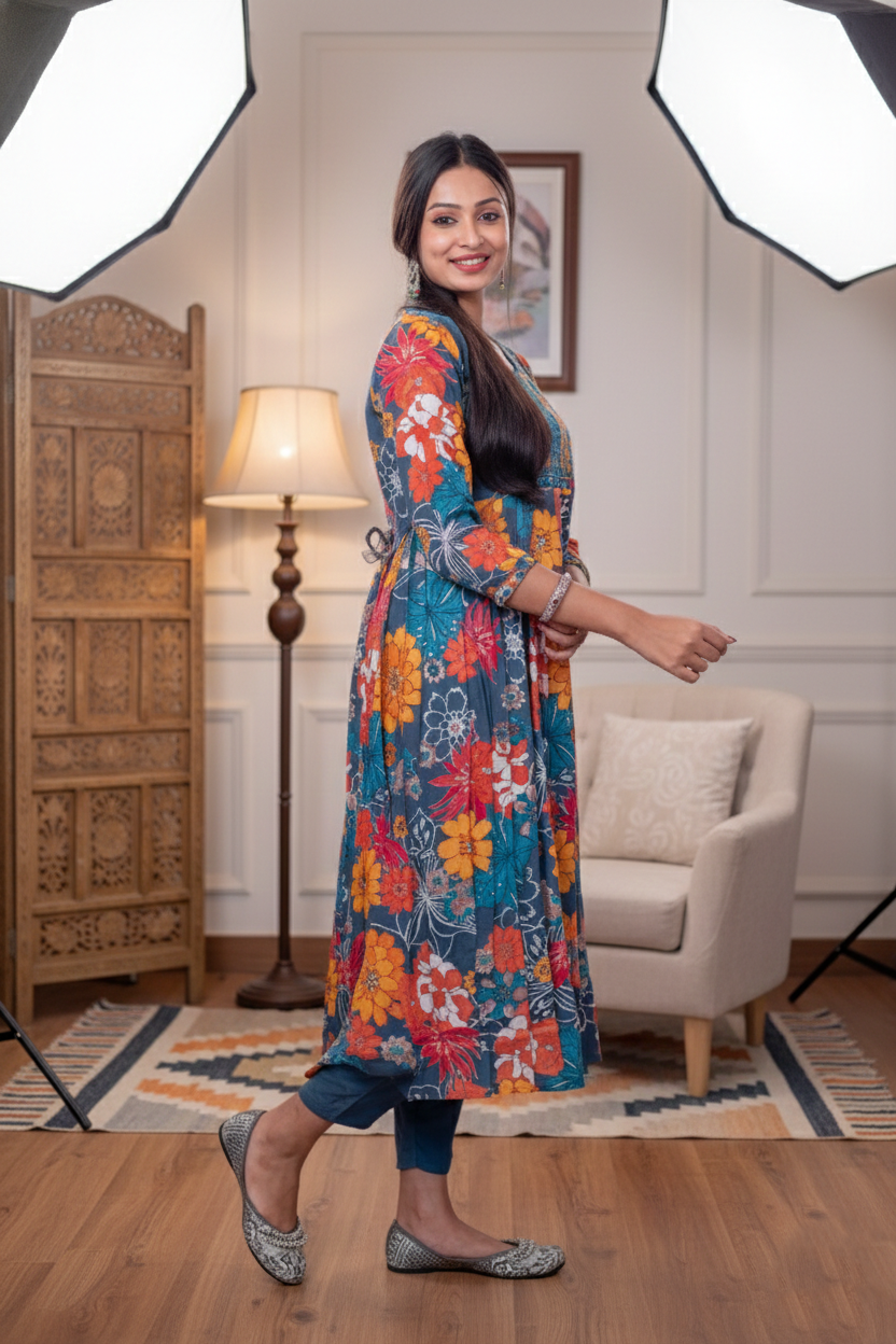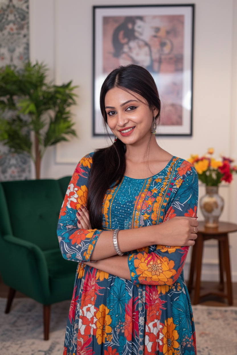 Step into effortless elegance with the Floral Breeze Teal Anarkali Kurti Set, designed to bring freshness and charm to your everyday wardrobe. Crafted with a soothing teal base and vibrant floral prints, this kurti features a graceful flared silhouette that flows beautifully with every movement. The three-quarter sleeves and round neckline add a classic touch, making it perfect for casual outings, office wear, festive gatherings, and day events.