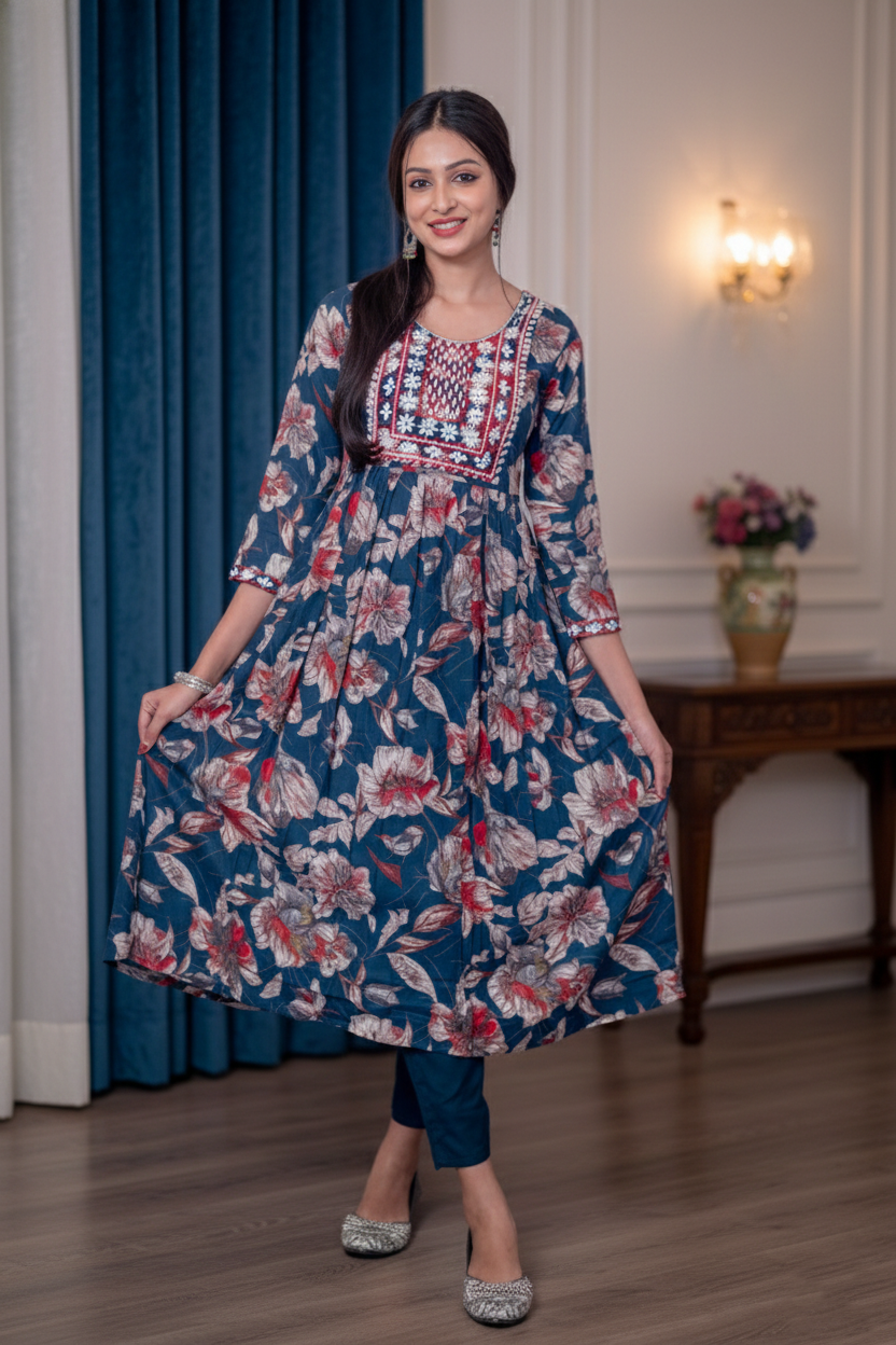 The umbrella cut silhouette gives a graceful flare, while the intricate embroidery work on the yoke enhances its traditional charm. Paired with matching comfortable pants and a convenient side pocket, this set is perfect for festive wear, office wear, family gatherings, and casual outings.