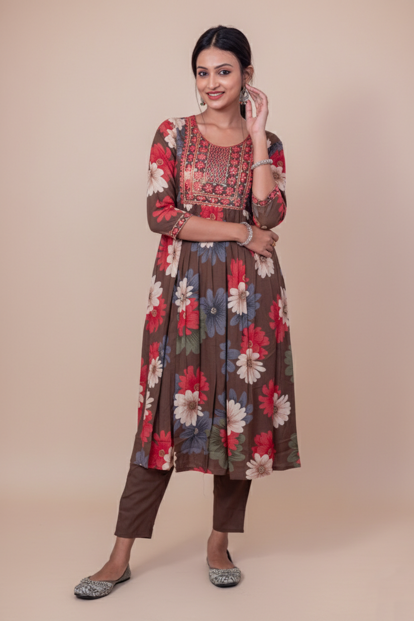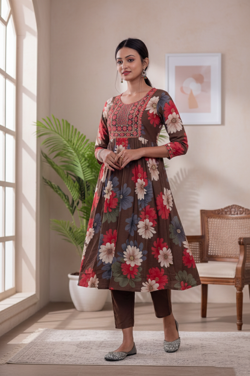 Bring home effortless elegance with the Vanika Bloom – Floral Brown Anarkali Kurti Set, designed for women who appreciate subtle beauty and everyday comfort.
