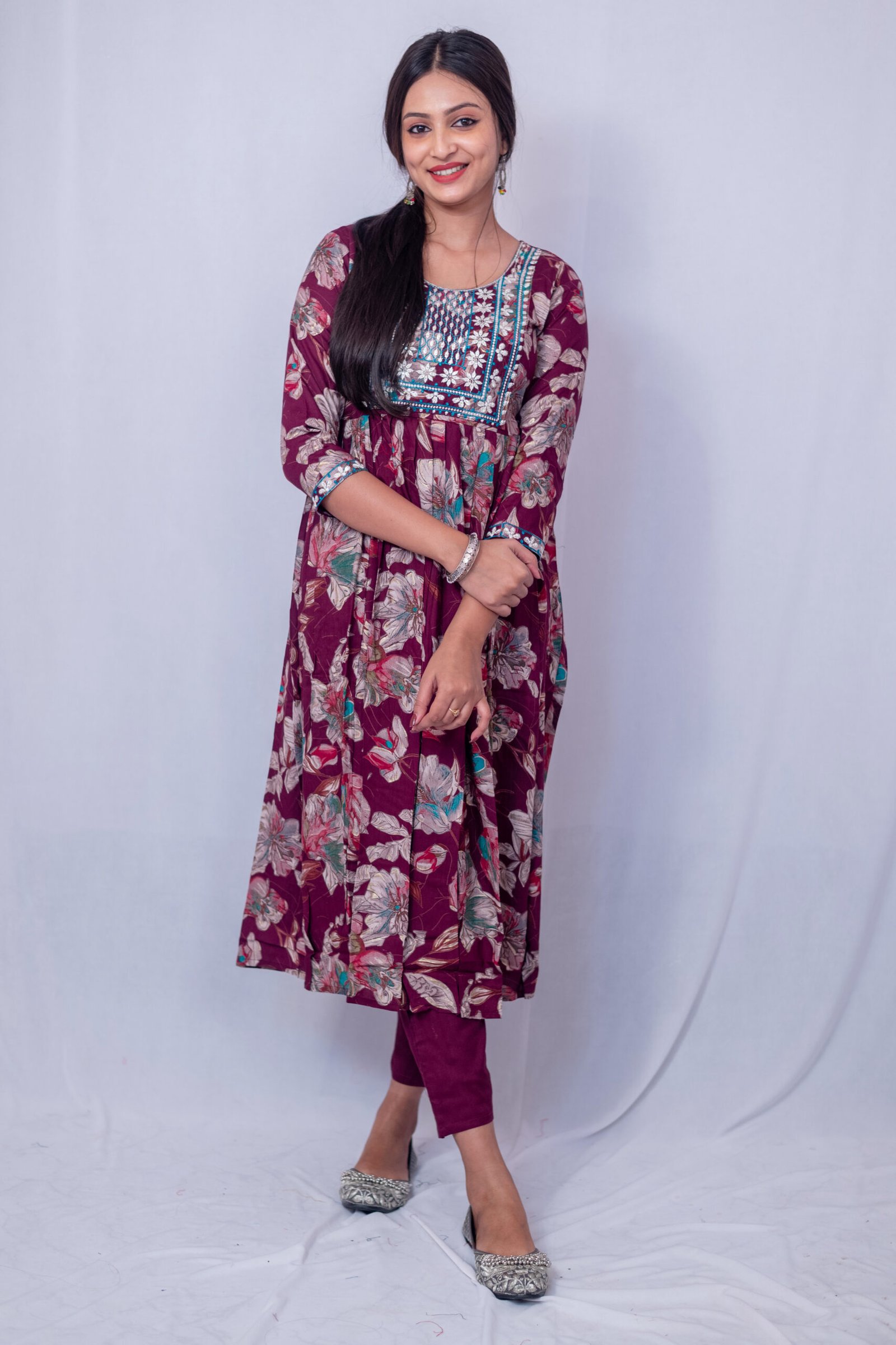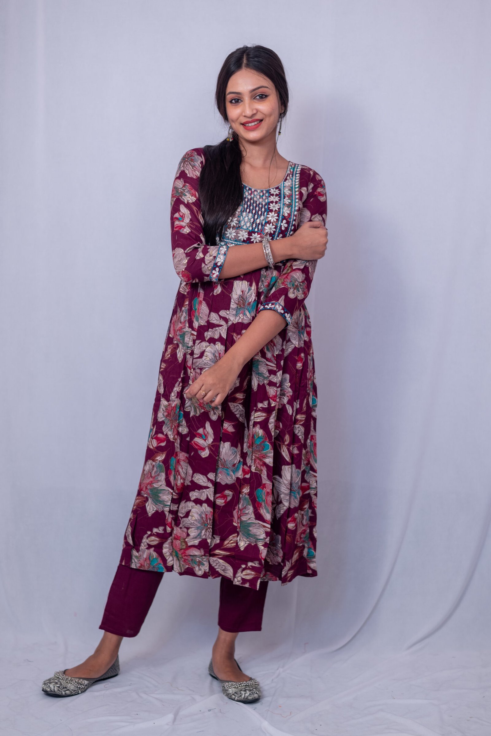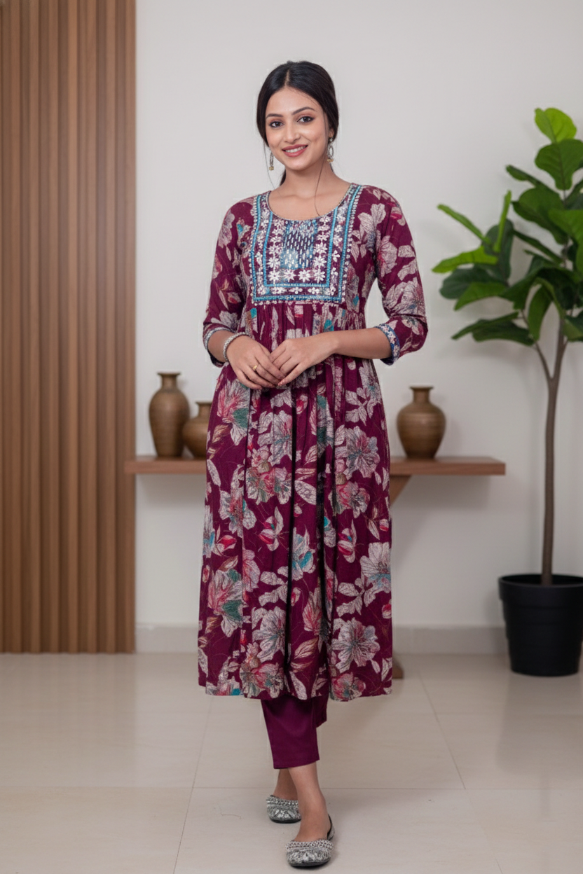 Step into graceful comfort with this beautifully designed floral kurta set, crafted for women who love soft colors and timeless ethnic appeal. The kurta showcases an enchanting mix of floral and leafy motifs in refreshing shades, perfectly balanced on a calming olive-green base. The finely detailed yoke adds a handcrafted touch, enhancing the overall elegance of the outfit.