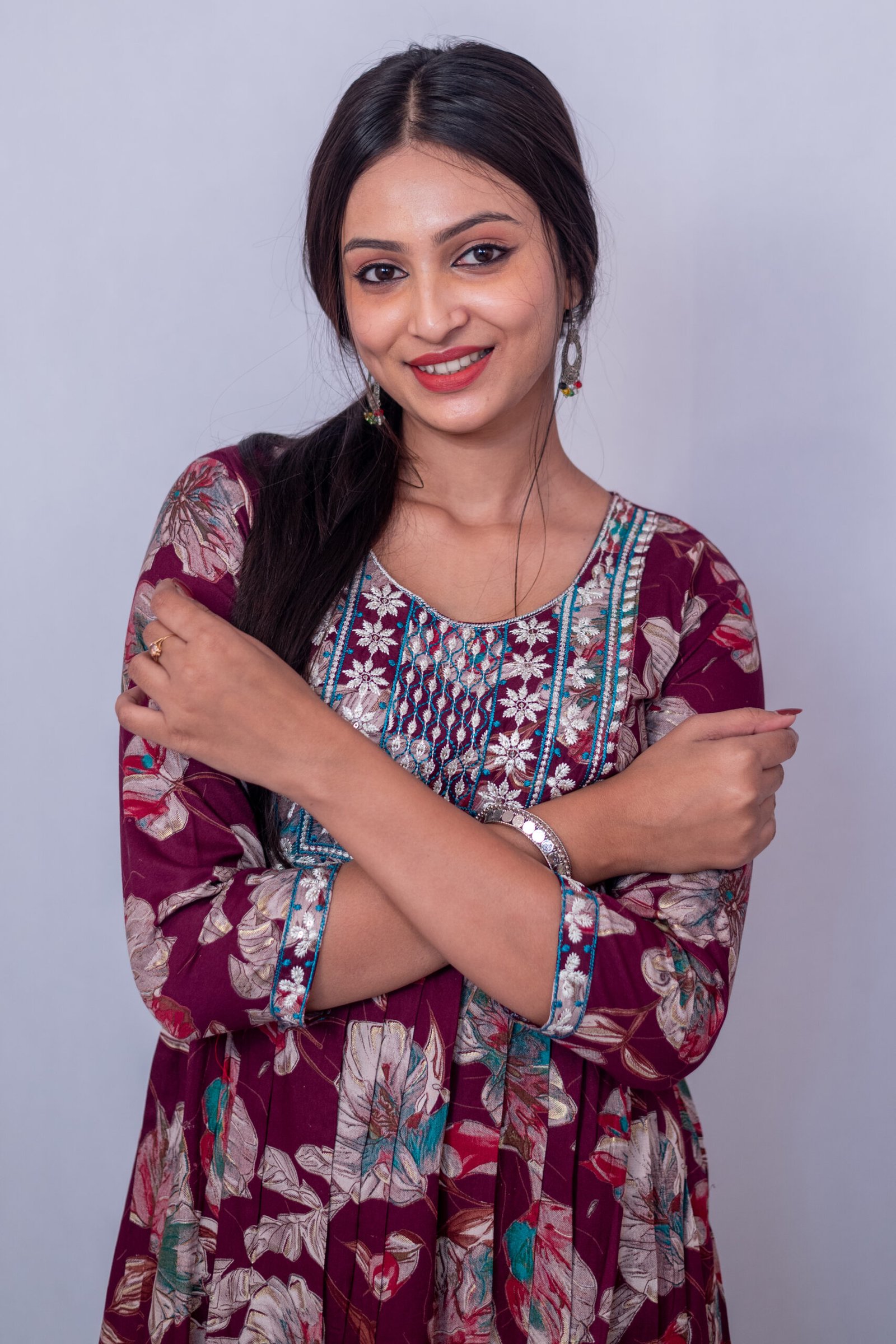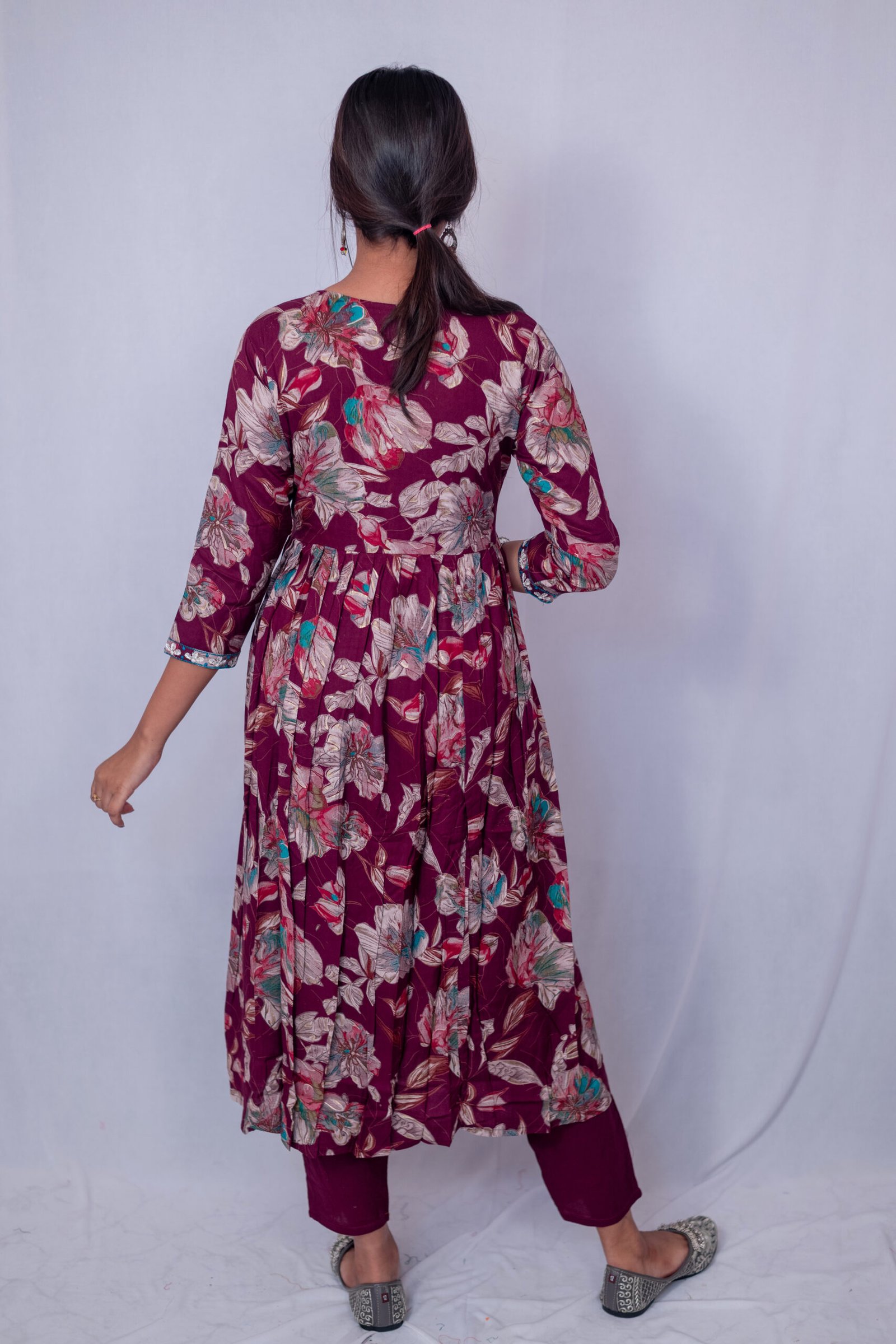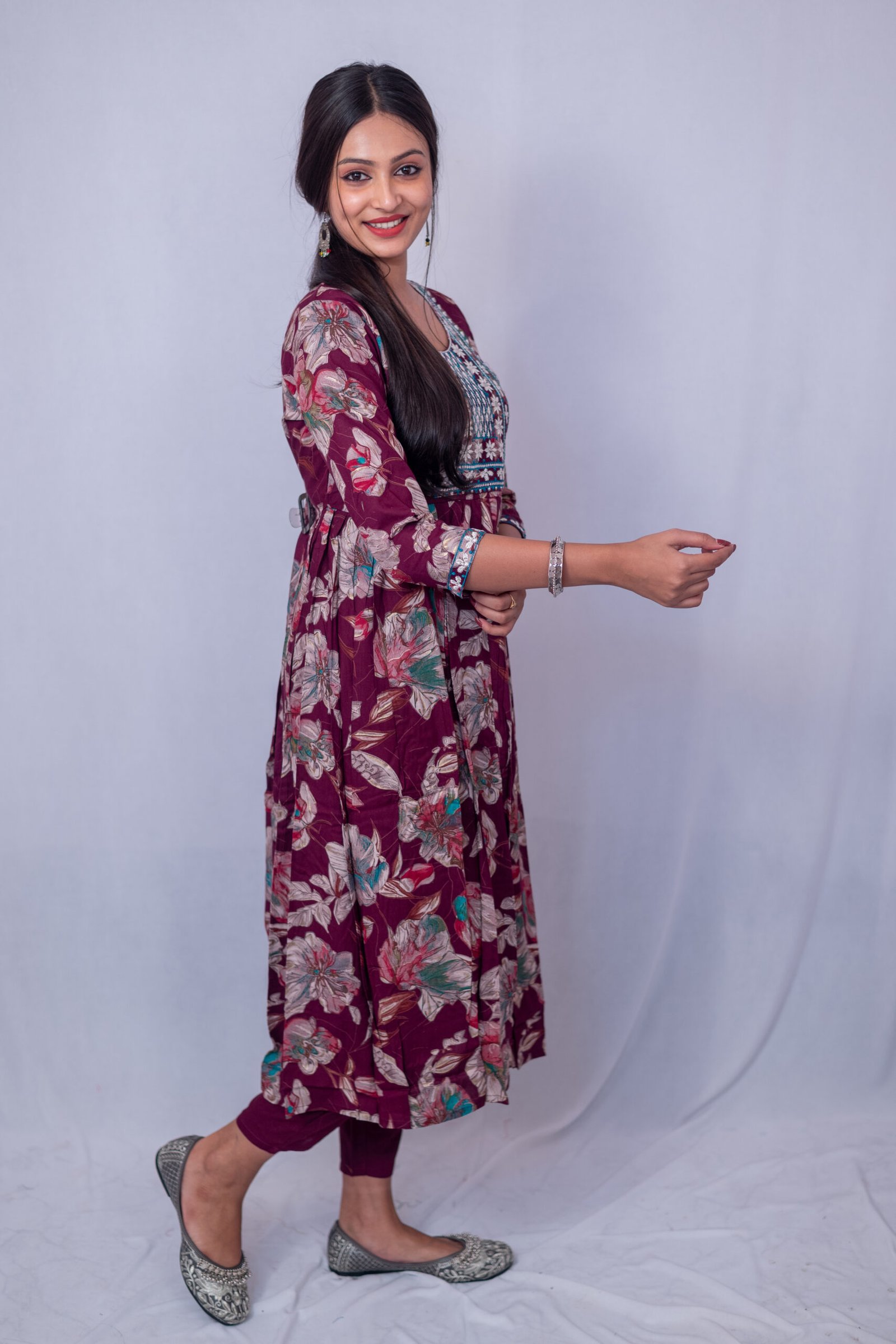 Step into graceful comfort with this beautifully designed floral kurta set, crafted for women who love soft colors and timeless ethnic appeal. The kurta showcases an enchanting mix of floral and leafy motifs in refreshing shades, perfectly balanced on a calming olive-green base. The finely detailed yoke adds a handcrafted touch, enhancing the overall elegance of the outfit.