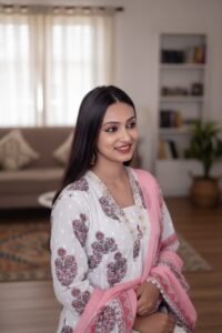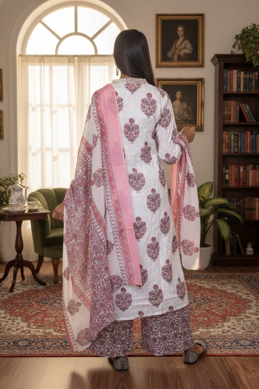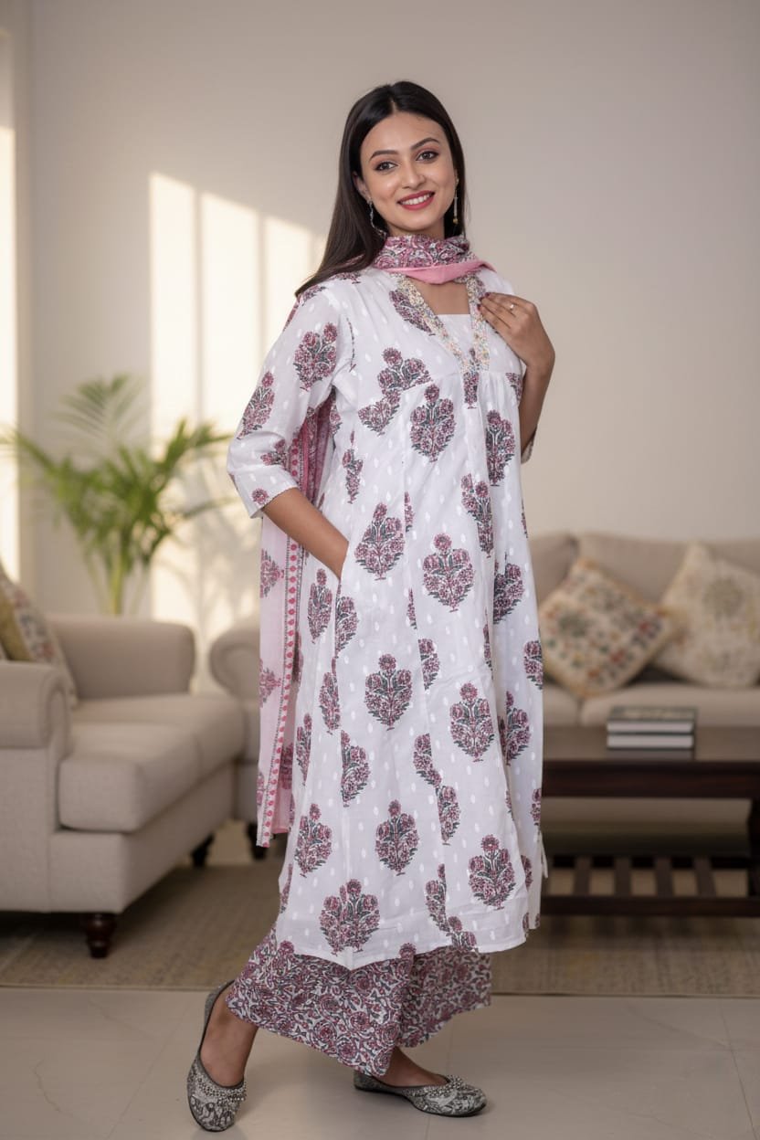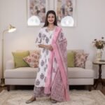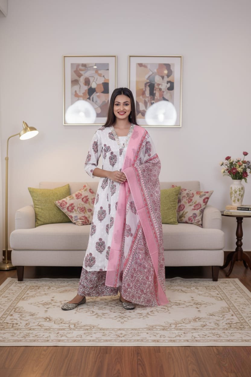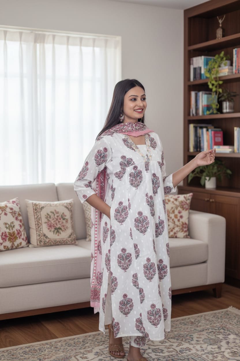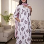 Elevate your ethnic style with this elegant 3-piece kurti set featuring a graceful blue floral print on a soft white base. Paired with matching pants and a lightweight dupatta, this set blends luxury, comfort, and timeless charm—perfect for festive days, office wear, and casual outings.