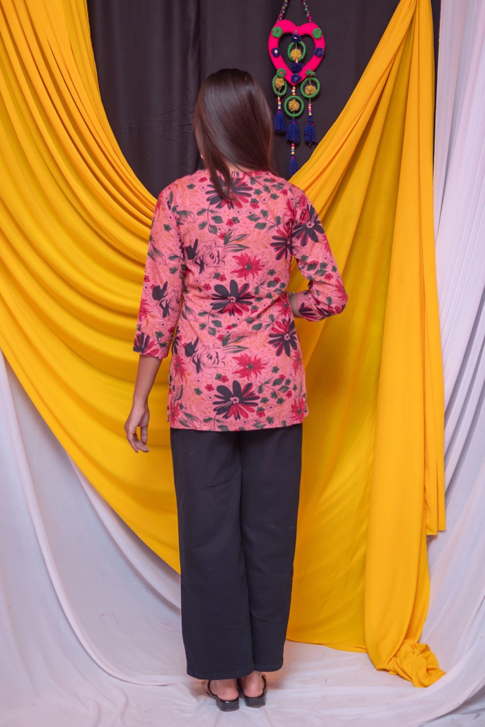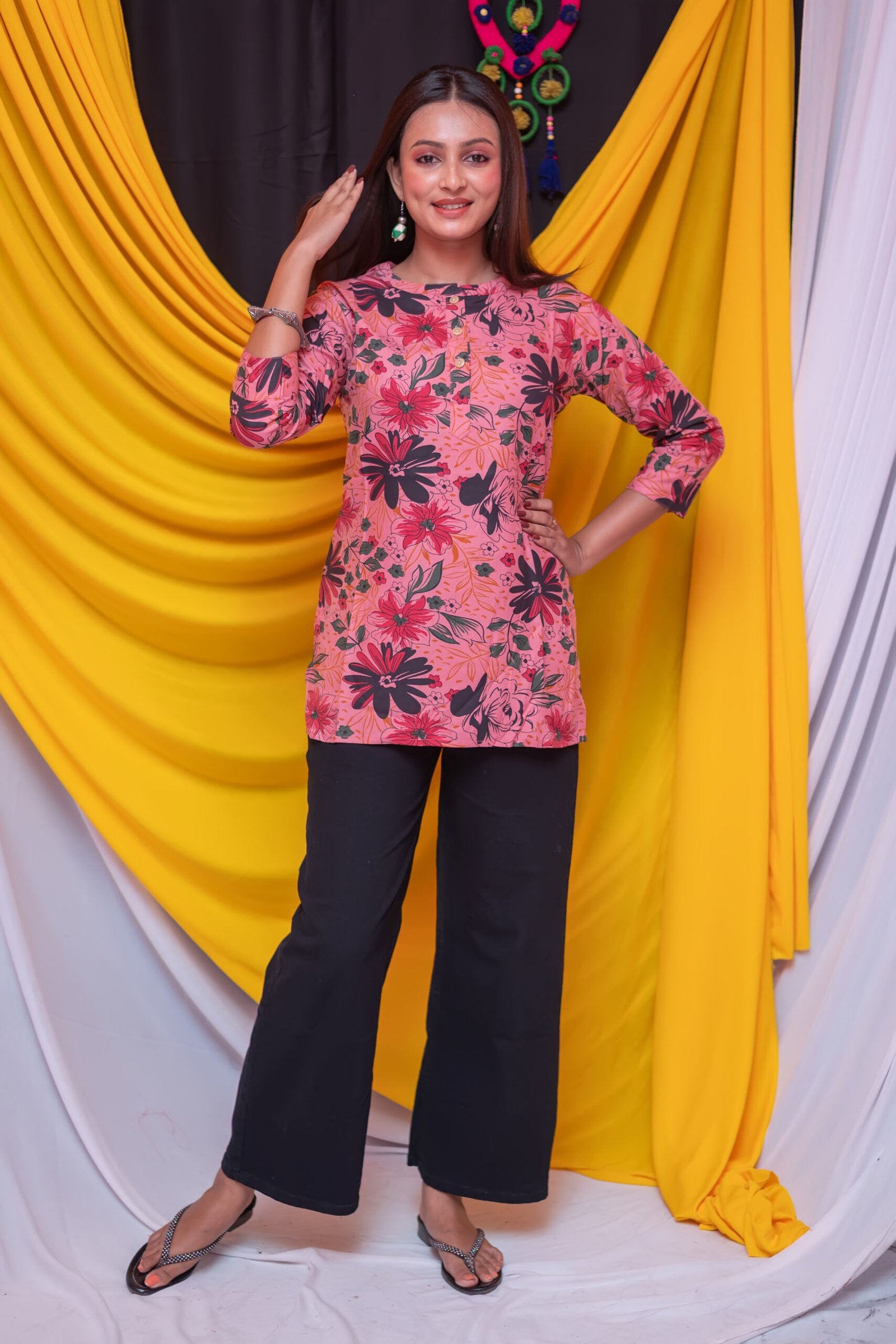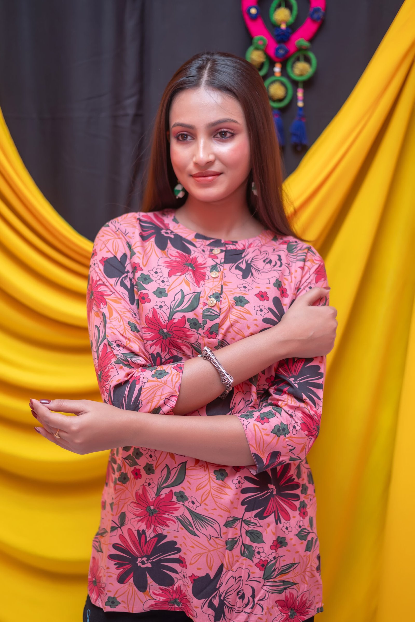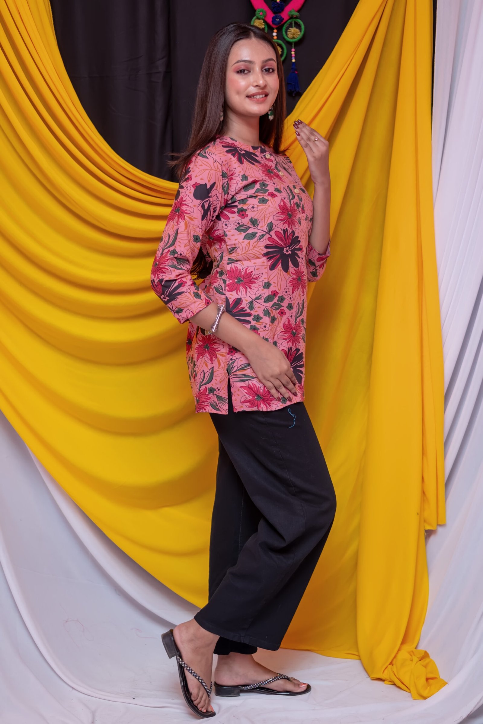 Upgrade your everyday ethnic wardrobe with this elegant Women’s Pink Floral Rayon Short Kurti Top. Designed with a beautiful all-over floral print, this kurti offers a perfect blend of comfort and modern style. Crafted from soft and breathable rayon fabric, it feels lightweight on the skin and keeps you comfortable all day long.