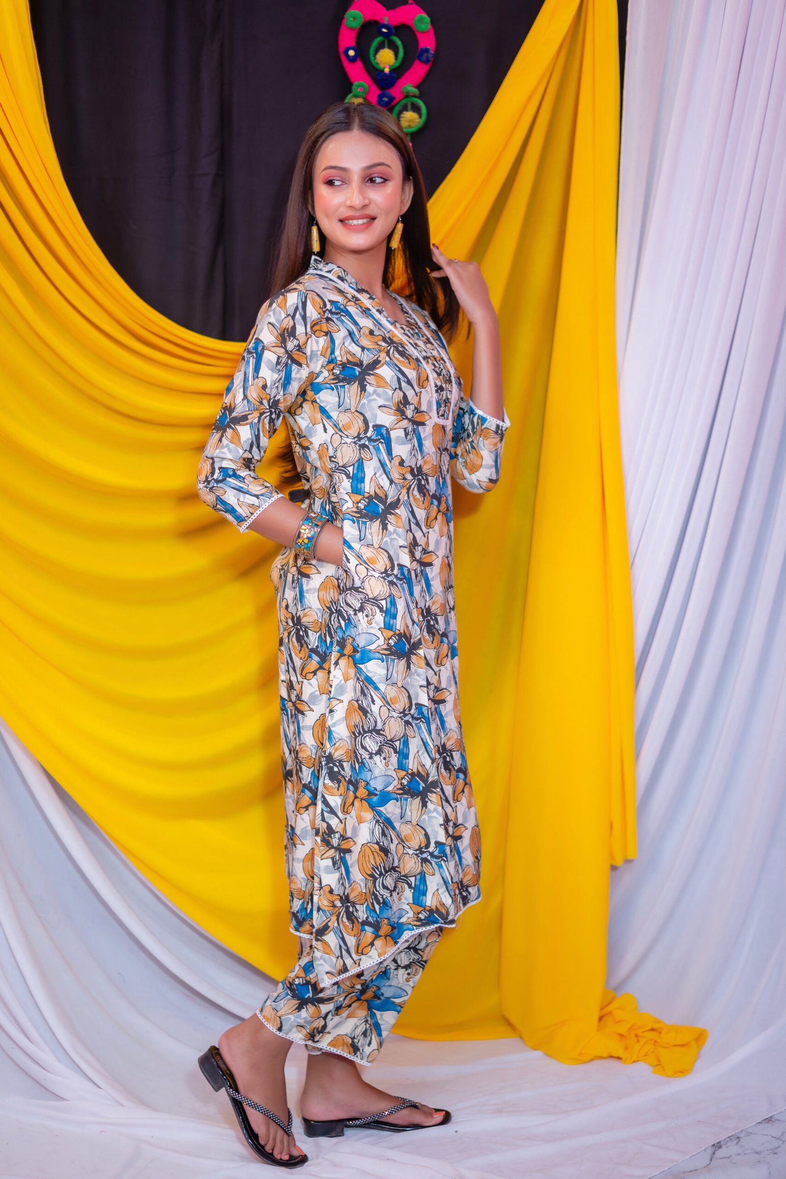Women’s Blue & Mustard Floral Printed Kurti – Elegant V-Neck 3/4 Sleeve Casual & Office Wear Ethnic Kurta