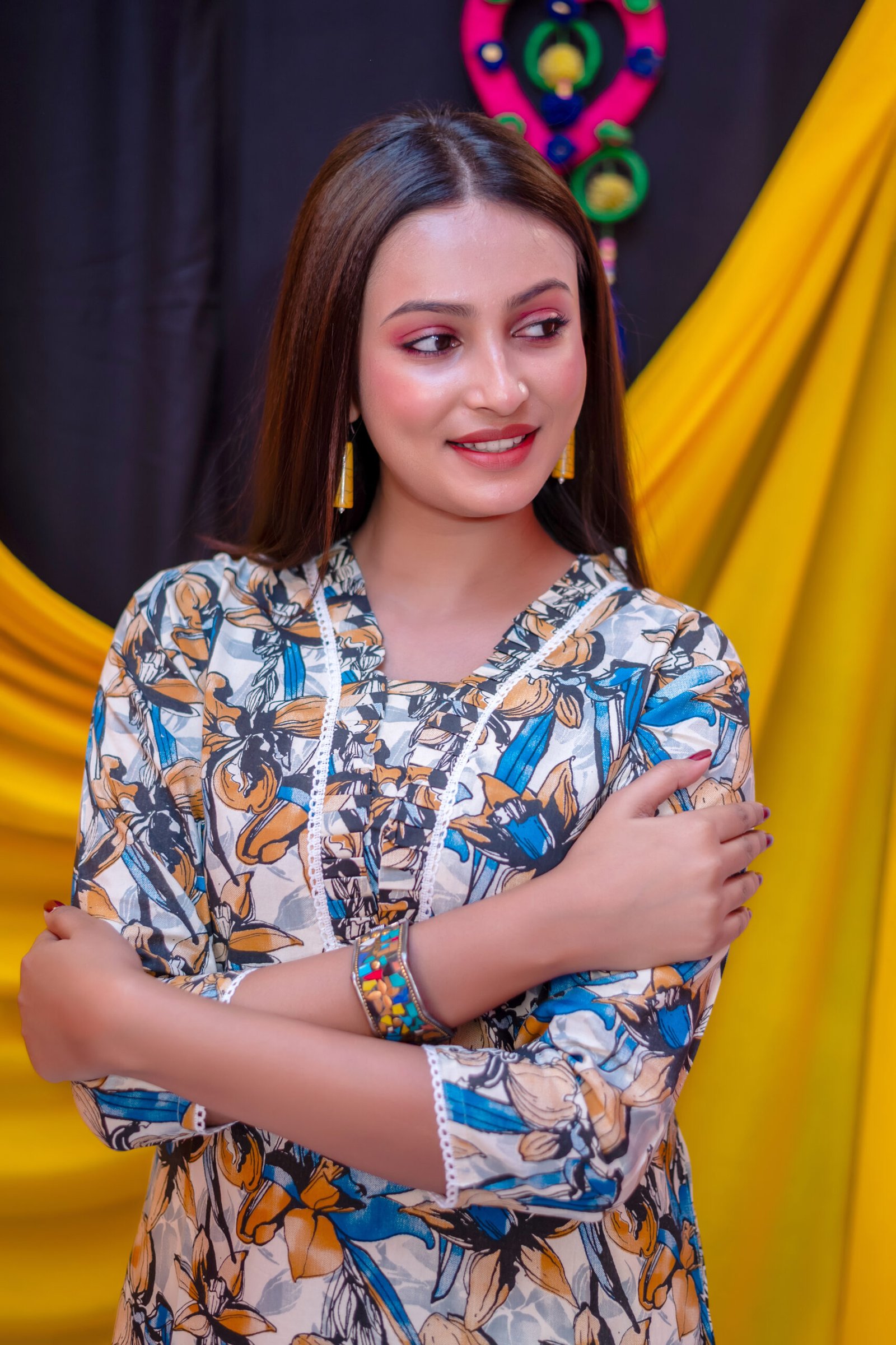 The kurti features a flattering V-neckline with delicate lace detailing that enhances its modern ethnic appeal. The eye-catching floral print in blue and mustard tones creates a refreshing and vibrant look, making it perfect for daily wear, office wear, casual outings, and small festive occasions.