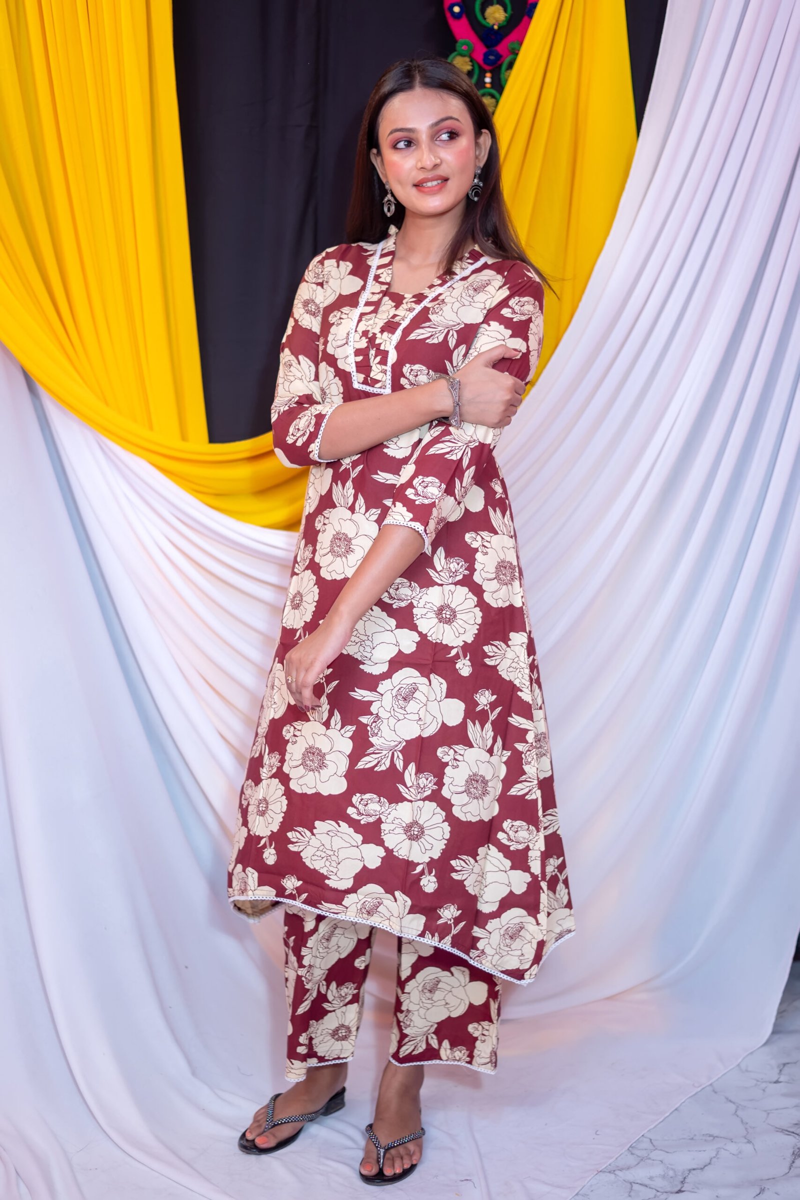 Upgrade your ethnic wardrobe with this beautifully designed Women’s Maroon & Cream Floral Printed Kurti Pant Set. Crafted from premium breathable fabric, this elegant outfit offers both comfort and style for everyday wear, office use, family gatherings, and festive occasions.