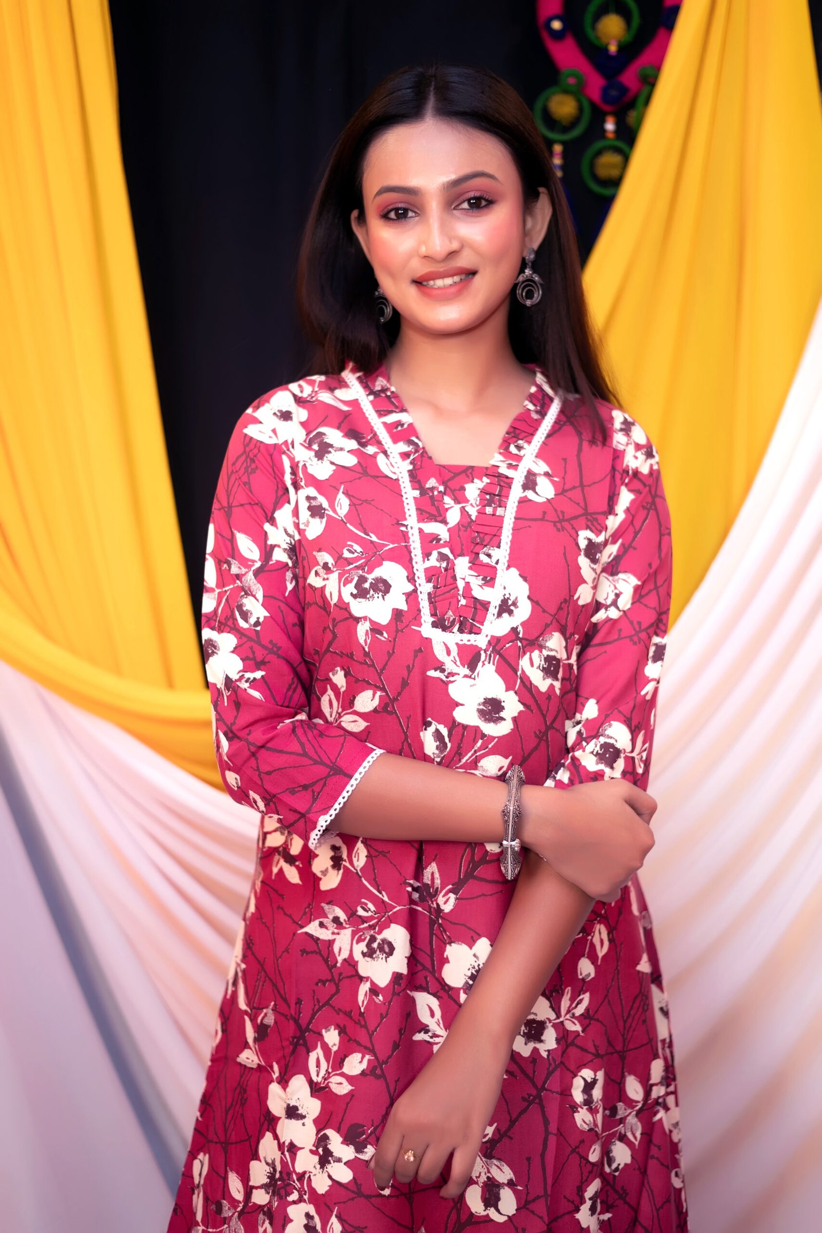 Upgrade your ethnic wardrobe with this beautifully designed Women’s Pink & Cream Floral Printed Kurti Pant Set. Crafted from premium breathable fabric, this elegant outfit offers both comfort and style for everyday wear, office use, family gatherings, and festive occasions.